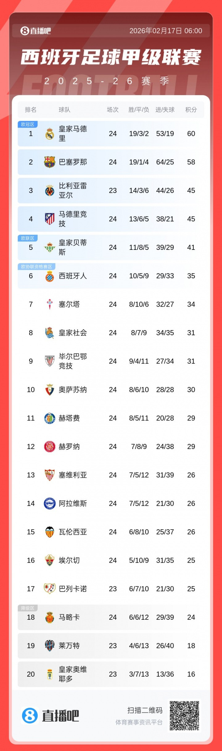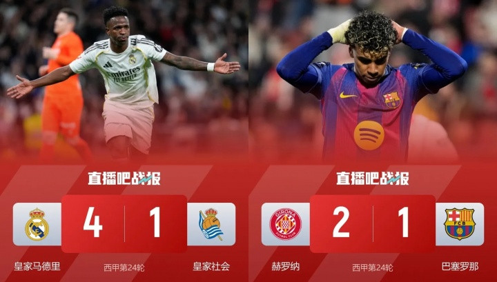 直播吧02月17日讯西甲第24轮,巴萨1-2不敌赫罗纳,无缘重回榜首,现逾期皇马2分名次西甲第2。