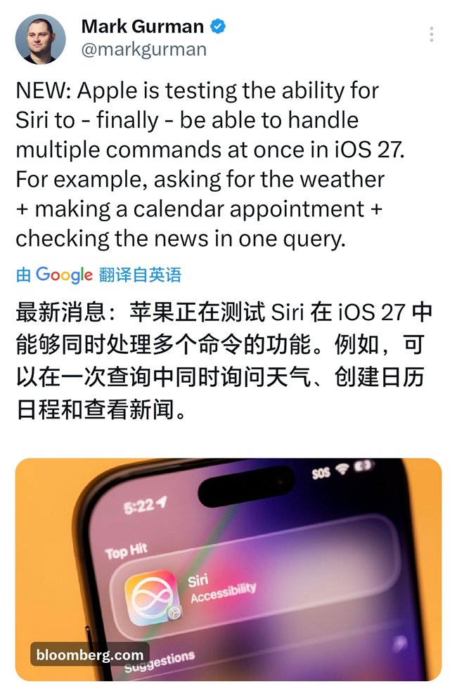 【iMobile爱科技资讯】苹果Siri的多指示并行功能终于要来了,据彭博社记者Mark Gurman爆料,苹果正在iOS 27系统中测试Siri同期处理多项任务的才能,浮浅来说,以后你不必再分屡次喊Siri,一句指示就能解决多件事:比如“查一下今天的天气、帮我创建下昼3点的会议日程、再给共事发个请示短信”,Siri会一次性完成总计操作,不必你反复叫醒,星空app官网版截止径直拉满。
