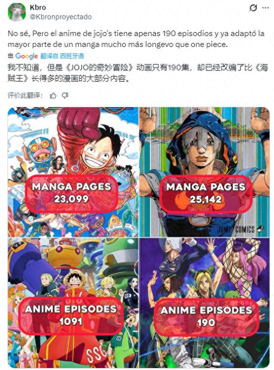 还有东谈主径直补刀:“你们知谈吗,《JOJO的奇妙冒险》动画190集,讲的实质可能比海贼王1000集还多。”