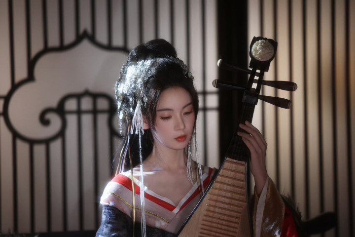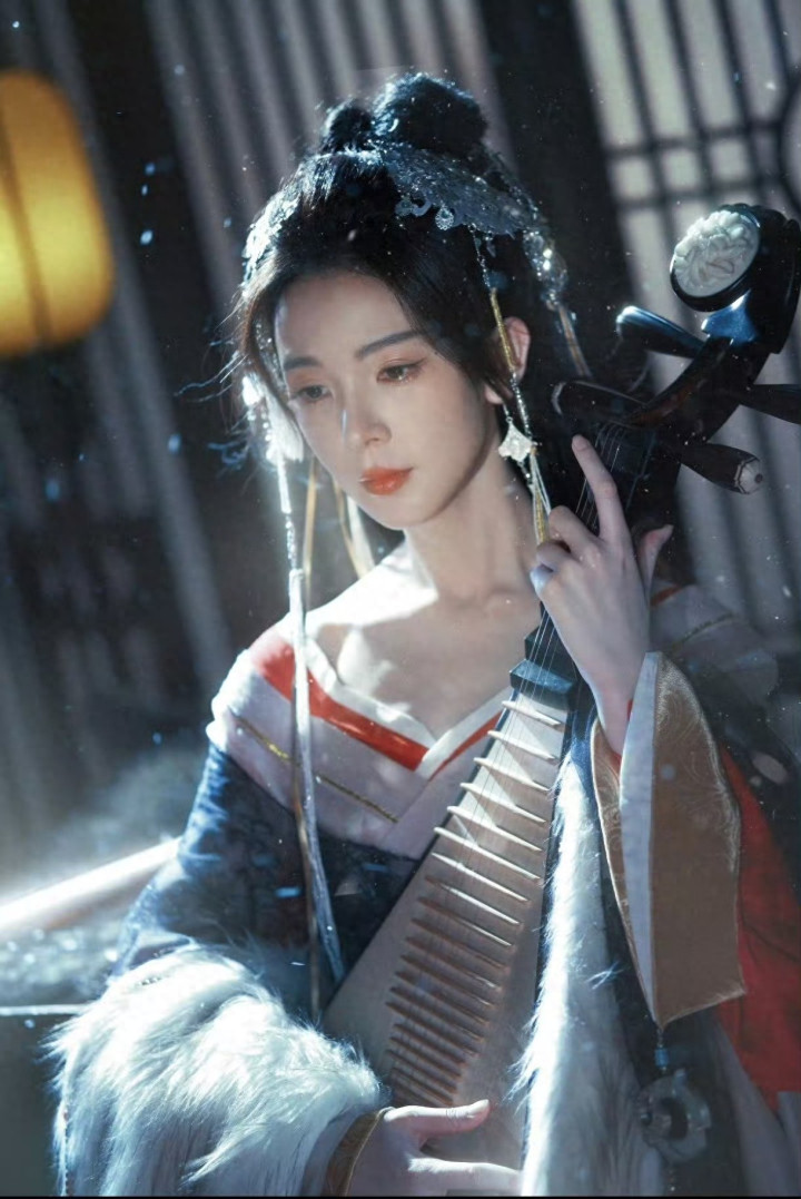 陈瑶于雪夜灯影里抱琵琶半遮面,银纹雕花发冠缀着金链流苏,衬得眉眼愈发清绝,红白相间的汉服裹着狐毛暖意,所作所为齐是东方好意思学的极致纵容。