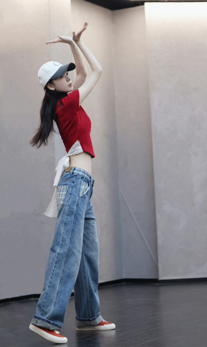 上身正红色短款修身T恤,后背蕾丝绑带诡计自满纤细腹腰,辣感与元气拉满。下穿水洗蓝阔腿牛仔裤,红白拼色棒球帽反戴,搭配同色系帆布鞋,芳华感悉数。