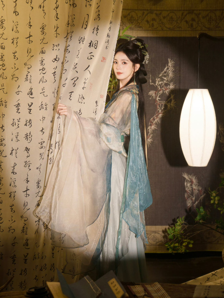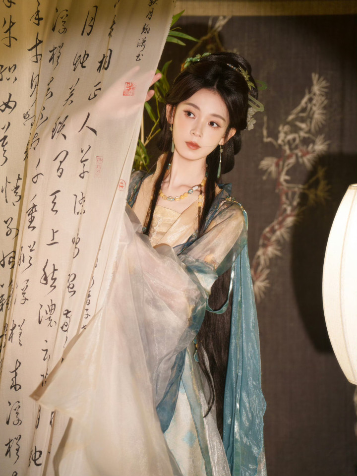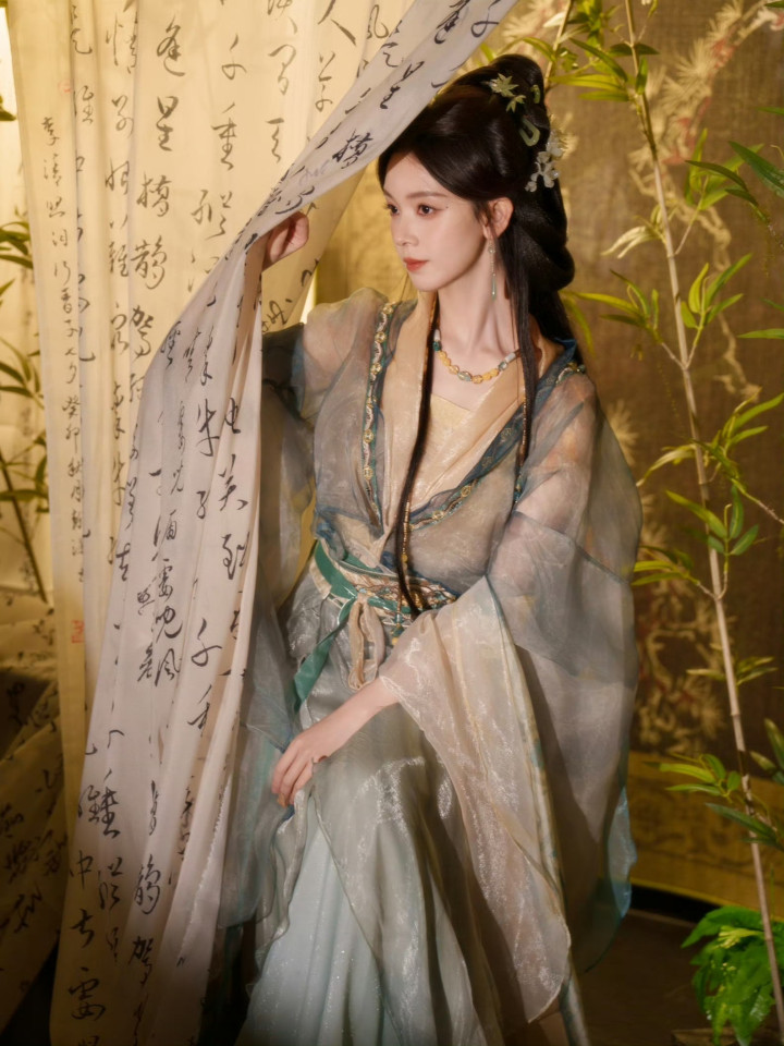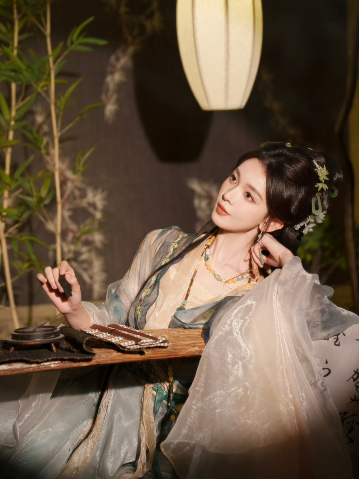 竹影书香环绕,她执书道卷轴而立,伶仃青碧鎏金渐变汉服仙气飘飘,内搭米金抹胸尽显肌肤胜雪,青绿色织金腰封收束腰线,勾画出窈窱形体。