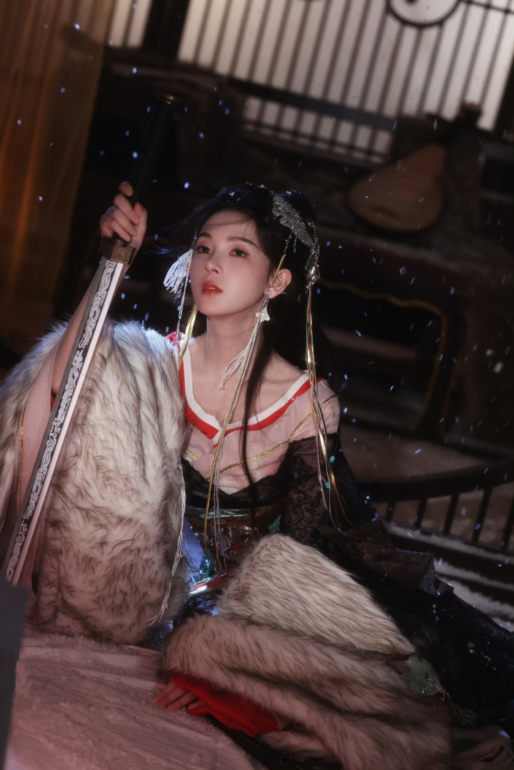 长剑横颈的俄顷,既有江湖儿女的飒爽凌厉,又藏着江南女子的温婉清绝。剑光映着她的眉眼,将侠骨与柔情揉进漫天风雪里,把古风侠女的风骨演绎得长篇大论。