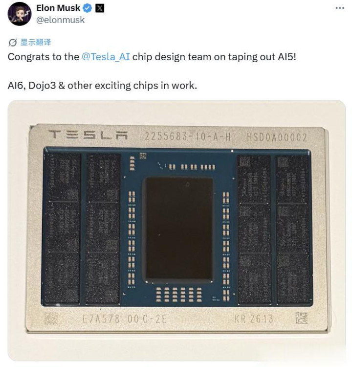 "恭喜特斯拉AI芯片贪图团队完成AI5的流片,AI6、Dojo 3以过火他令东说念主爽直的芯片正在研发中”,马斯克在酬酢媒体示意,“这将成为有史以来产量最大的AI芯片之一。"